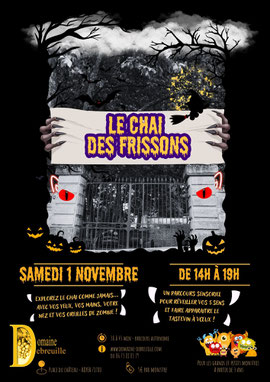 Grande première cette année au Domaine ! Le chai se déguisera et se transformera en un parcours mystérieux où petits monstres et grands zombies partiront à l’aventure entre les fûts et les pressoirs.